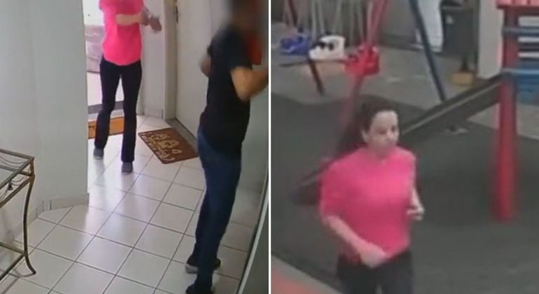 Pela câmera externa do prédio, é possível ver a atiradora fugindo pela área de lazer.