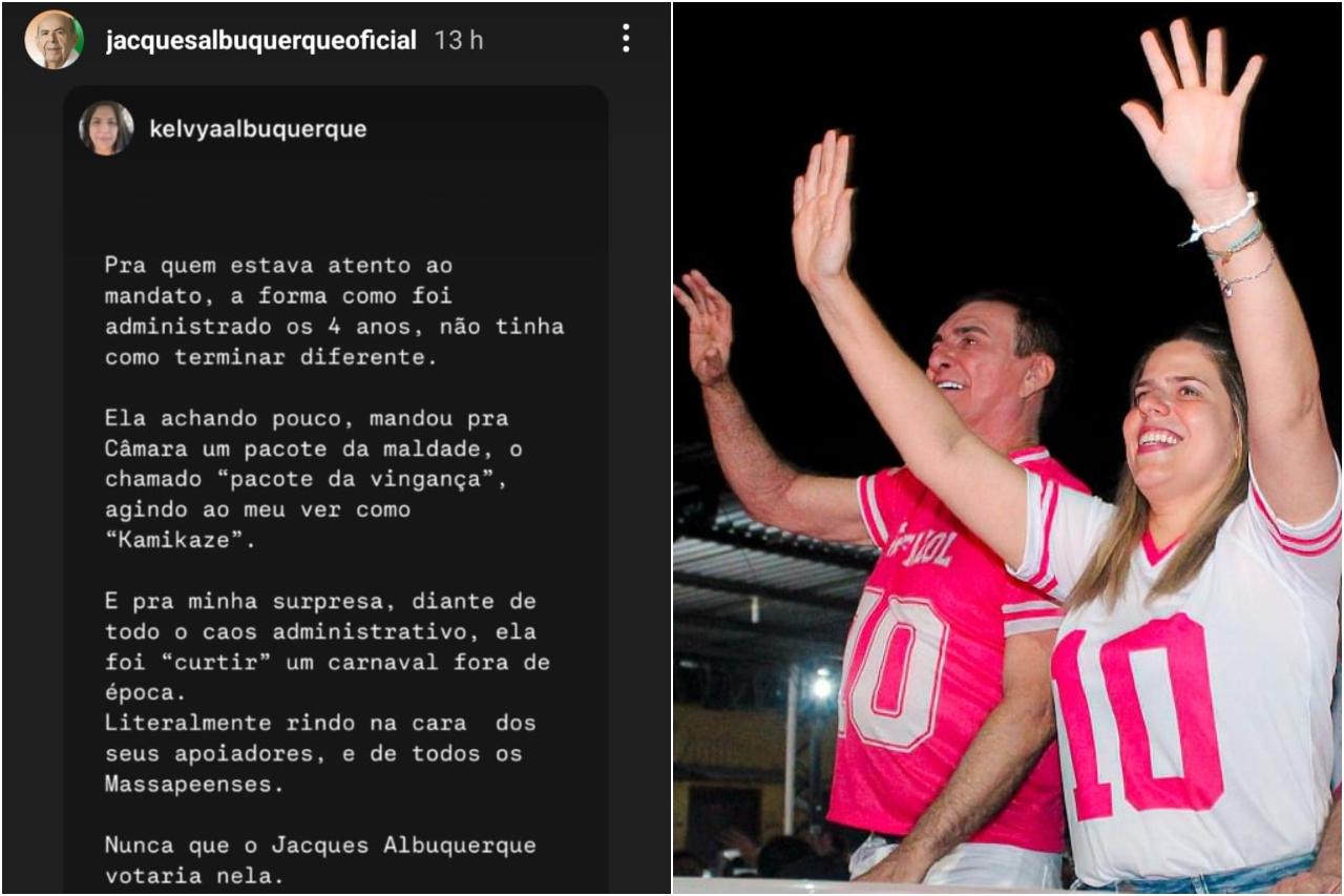 "Para quem estava atento ao mandato, a forma como foi administrado os 4 anos, não tinha como terminar diferente. Ela achando pouco, mandou para Câmara um pacote da maldade, o chamado 'pacote da vingança', agindo ao meu ver como 'Kamikaze'. E pra minha surpresa, diante de todo o caos administrativo, ela foi 'curtir um carnaval fora de época'. Literalmente rindo na cara dos seus apoiadores, e de todos os massapeenses", escreveu Kelvya na publicação. "Nunca que Jacques Albuquerque votaria nela", finalizou a mulher.