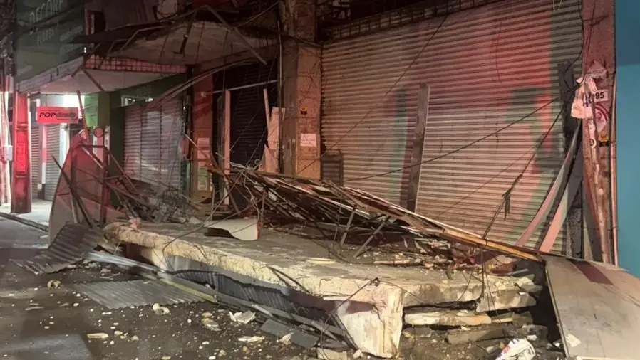 Imagens do local mostram a estrutura de concreto ocupando toda a calçada dos estabelecimentos, assim como uma grande quantidade de ferro e entulho retorcidos.